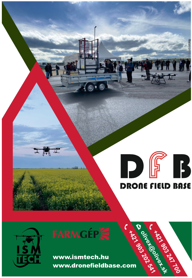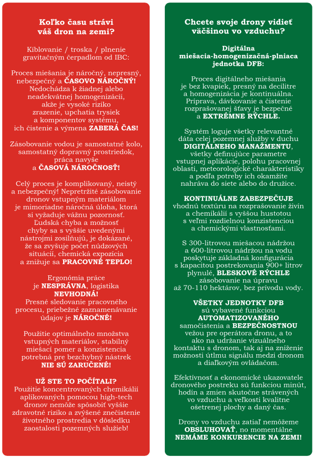 Efektívnosť celého procesu začína mobilitou celého zariadenia, ktoré sa zmestí na klasický prívesný vozík a obsahuje 300 litrovú nádrž na miešanie a 900 litrovú nádrž na vodu + di- gitálnu miešaciu – homogenizačnú – plniacu ednotku DFB, obslužný materiál pre drony a vežu operátora. Táto výbava stačí na ošet- renie 70 až 110 ha. Pracovný výkon s jedným dronom je približne 10 ha za hodinu. Do toho systému je možné zapojiť aj viac pracovných dronov.