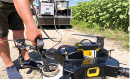 Podstatný rozdiel je však v množstve vody. Pre dron stačí na dosiahnutie požadovaného účinku len 8 l/ha. Toto je dosiahnuté vyš- šou koncentráciou aplikovaného média, čo je možné vďaka digitálne riadenej miešacej jednotke, ktorá zaručuje na jednej strane ab- solútne presný miešací efektívny pomer vody a účinnej látky a na strane druhej znižuje na minimum environmentálne bezpečnostné riziko, čo v klasickej forme miešania postre- kov na oko alebo odmerkami nie je možné dosiahnuť.