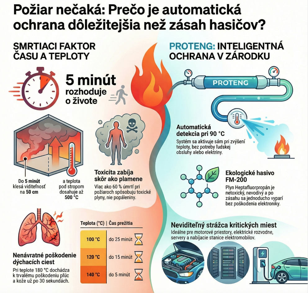 Z horeuvedených faktov vyplýva, že po vzniku požiaru nemožno spoliehať sa na rýchly zásah hasičov, alebo aj zdravotnej služby. Niektoré požiare, najme elektromobilov, vozidiel na plynný pohon sú ťažko uhasiteľné aj pre požiarne jednotky. Treba si uvedomiť aj to, že pri protipožiarnom zásahu vznikajú značné škody ktoré spôsobuje použité hasivo. Na riešenie týchto problémov bol vyvinutý automatický spôsob hasenia, so zameraním na uhasenie ohnísk ešte v zárodku požiaru hasivom, ktoré nie je toxické a nezanechá po sebe sekundárne škody. Lokálne automatické hasiace zariadenie PROTENG je také cenovo prístupné zariadenie, ktoré dokáže pred požiarmi chrániť naše zariadenia, akými sú motorové vozidlá, akumulátorové súbory, elektrické rozvodne, servery a iné priestory, v ktorých možno predpokladať vznik požiarov následkom technických porúch, únavy materiálov, pôsobením hlodavcov a podobne. Hasiace zariadenie detekuje zvýšenú teplotu nad 90°C a okamžite vypustí hasiaci plyn Heptafluorpropán (aj pod názvom FM-200) do lokality kde sa prejavil požiar. Hasiaci plyn zníži okolitú teplotu, vylúči kyslík tak, že nezanechá po sebe odpad a nepoškodí ovzdušie. Svojim vysokým hasiacim účinkom automaticky, bez nutnosti obsluhy zastaví voľný rozvoj požiaru. Osoby, predmety, alebo aj zariadenia, ktoré sú v blízkosti hasenia nie sú ohrozené teplotou, ani toxicitou. Hasiaci plyn neleptá, nezmáča okolie, nevedie elektrický prúd a po zásahu sa vyparí do ovzdušia. Systém môže v prípade požiaru aj informovať určené osoby prostredníctvom mobilnej aplikácie, alebo určený non-stop dispečing.